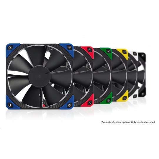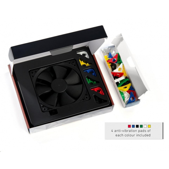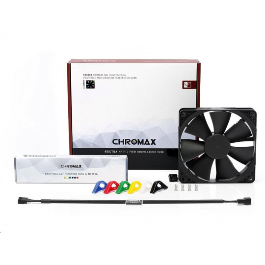 ventilátor, tichý, rozmer 120x120x25mm, hlučnosť 18.6 až 22.4dB, prietok 74.3 až 93.4 m3/h, 300 až 1500 otáčok, optimalizovaná geometria a povrch 7 lopatiek, SSO2, edícia Chromax - vymeniteľné farebné antivibračné podložky