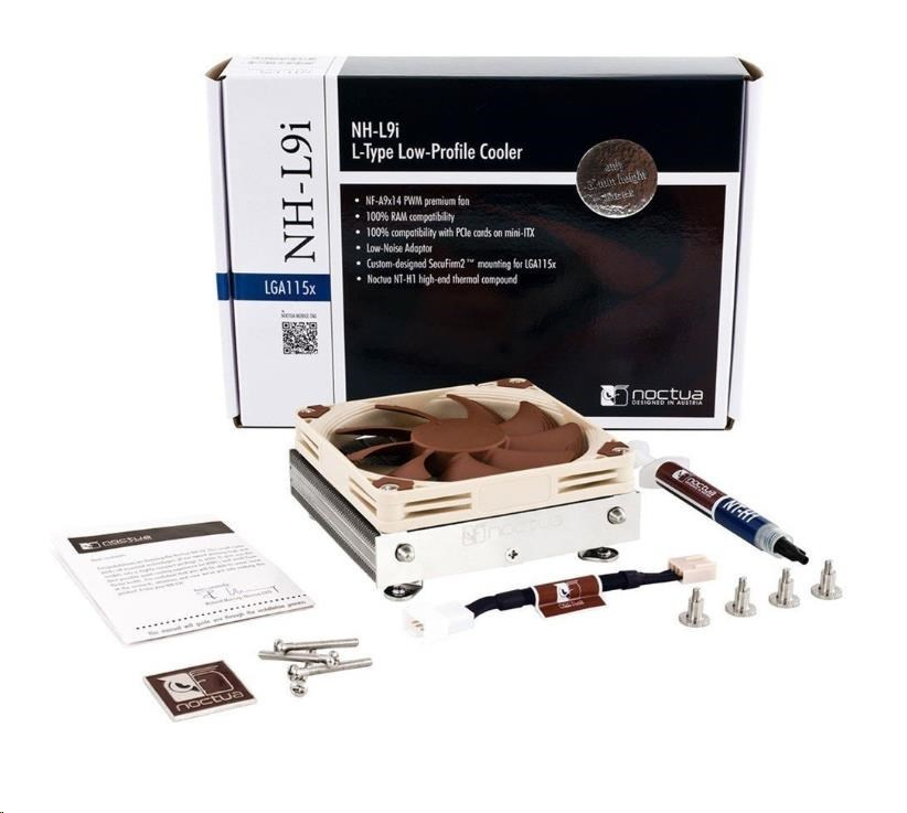 The NH-L9i je prémiový kvalitný tichý chladič procesora pre Intel LGA115x-based HTPCs a systémy s malým formátom. Pri super nízkom profile len 37mm je NH-L9i ideálny pre extrémne tenké prípady a vďaka svojej 95x95mm základni poskytuje plnú kompatibilitu s vysokými RAM modulmi a VGA kartami na mini-ITX základných doskách. Na mieru navrhnutý systém upevnenia SecuFirm2™ pre LGA115x uľahčuje inštaláciu a vďaka vysoko optimalizovanému prémiovému ventilátoru NF-A9x14, ktorý podporuje úplnú automatickú reguláciu otáčok cez PWM, je NH-L9i mimoriadne tichý. Dopĺňa ho renomovaná teplovodivá pasta Noctua NT-H1, ktorá spája všetko, čo používatelia očakávajú od väčších chladičov Noctua, do super kompaktného balenia pre tenké HTPC systémy.