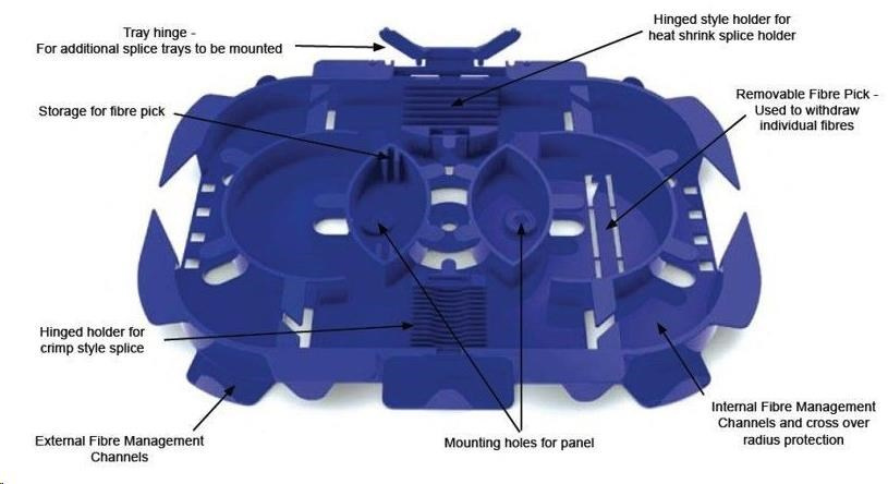 - dva hrebene s celkovou kapacitou 24 chráničov zvarov. (Uloženie a konštrukcia výklopných hrebeňov umožňuje viesť vlákna aj pod nimi