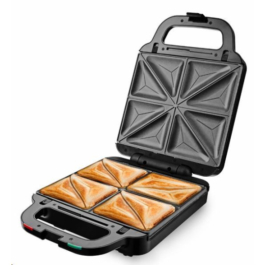 Multifunkčný toastovač 3 v 1, 3 vymeniteľné dosky s kvalitným nepřilnavým povrchom, Sendvičovač pre 4 sendviče, vafle a grilovanie, Funkcia otvoreného grilu, Tepelne izolované držadlo, Jednoduché čistenie, platne umývateľné aj v umývačke riadu, Svetelná signalizácia (napájanie, ohrev) Tepelná poistka, Napájanie: 220 - 240V~ 50Hz, 1 400 W