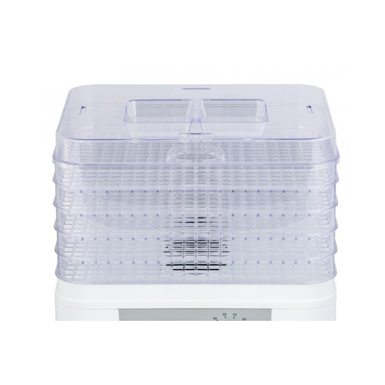 Sušička potravín s piatimi nastaviteľnými mriežkami, vysokoúčinný ohrievač a ventilátor zabezpečujú dôkladnú cirkuláciu vzduchu pre rýchle a efektívne sušenie, jednoduché ovládanie pomocou otočného ovládača teploty, rozsah nastaviteľnej teploty od 35 ° C do 70 ° C, bezpečnostná poistka, napájanie 230V ~ 50Hz, 230W, šírka: 320 mm, výška: 270 mm, hĺbka: 255 mm