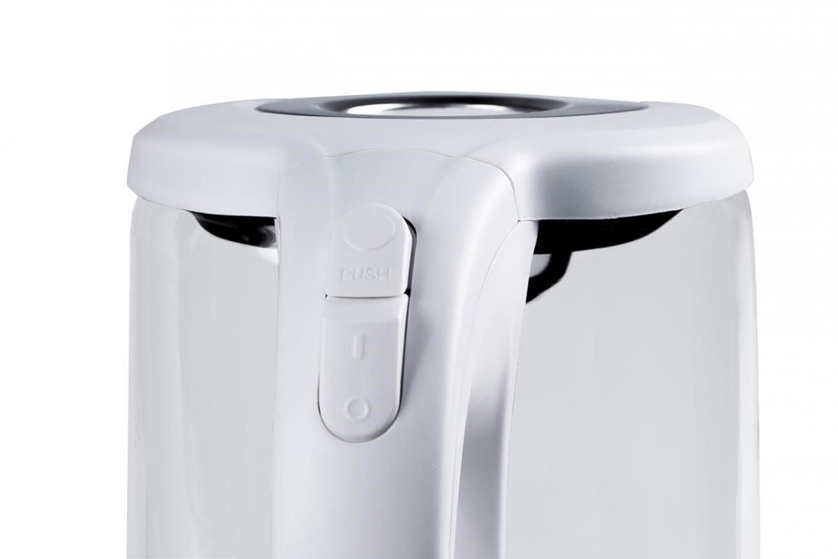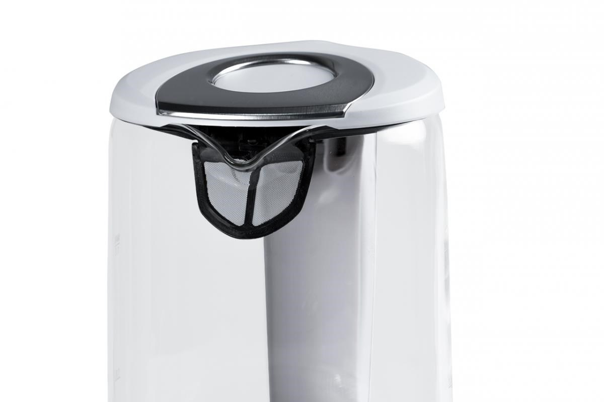 Čajová sklenená kanvica, vnútorné LED osvetlenie počas prevádzky, moderný nerezovo-sklenný dizajn, objem vody: max. 1,7 l, varná nádoba na odnímateľnom 360 ° otočnom podstavci, topné teleso prekryté doskou z ušľachtilej ocele, ochrana pred ohrevom bez vody, automatické vypnutie, elektrický kábel s priestorom na uloženie v podstavci, napájanie: 220 - 240V ~ 50 / 60Hz, max. 2 200 W
