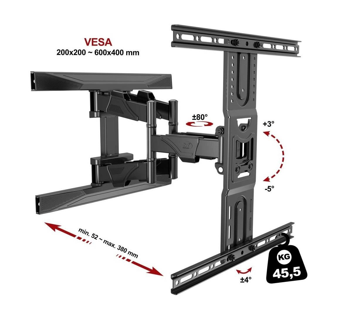 Kvalitný držiak na Tv NB DF600-P6 Kvalitný polohovateľný držiak na Tv 43" až 75", výsuvný 52-380mm, otáčanie do strán +/-60°, sklápačka +3°/-5°, VESA 200x200 až 600x400, nosnosť 45,5kg Otočný držiak televízie, jednoduchá inštalácia na stenu, veľmi kvalitná spoľahlivá konštrukcia. Držiak Tv NB DF600-P6 je ideálny na televízie s hmotnosťou do 45kg a VESA štandardmi od 200x200 do 600x400, veľkosť Tv by mala byť ideálne v rozmedzí 43" až 75". Možnosť vysúvania Tv od steny do vzdialenosti až 38cm a mierneho sklápenia Tv +3° až -5° a otáčania do strán až +/- 60°. V prípade nerovností na stene je možné rovinu televízie upraviť +/- 4°. Farebné prevedenie čierne, balenie vrátane montážneho materiálu, záruka 5 rokov. Vynikajúci nástenný držiak na otáčanie televízie NB DF600-P6 Technické údaje: nosnosť držiaka 45,5kg ideálny na Tv s uhlopriečkou 43" až 75" podpora VESA štandardov 200x200 až 600x400 nastavenie vzdialenosti od steny 52 až 380mm otočenie Tv do strán až +/- 60° možnosť sklápať Tv +3° až -5° regulácia roviny obrazovky +/- 4° úchyty na káble dizajnové krytky nástenného úchytu špičková, veľmi pevná a spoľahlivá konštrukcia materiál oceľ záruka 5 rokov Široká škála polohovania televízie na držiaku Tv NB DF600-P6 Držiak DF600-P6 podporuje VESA štandardy: VESA 100x200 VESA 200x200 VESA 300x200 a 200x300 VESA 300x300 VESA 400x200 a 200x400 VESA 400x300 a 300x400 VESA 400x400 VESA 600x400 Výborný držiak so spoľahlivou konštrukciou bez vôlí a bezúdržbovým prevedením čepov v kĺboch držiaku. Držiak DF600-P6 je vhodný na všetky televízory s hmotnosťou do 45,5kg, ktoré podporujú ktorýkoľvek z vyššie uvedených VESA štandardov.