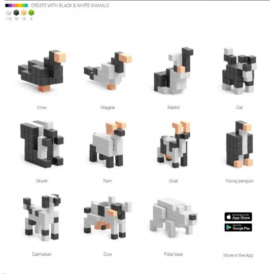 Dizajnová séria PIXIO BLACK AND WHITE Animals obsahuje 195 PIXIO blokov v 4 farbách. Umožňuje