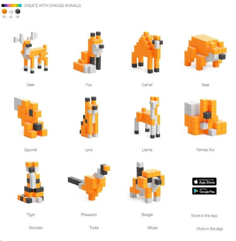 PIXIO ORANGE ANIMALS DESIGN SERIES obsahuje 162 PIXIO blokov v 3 farbách. Umožňuje vám oživiť vaše