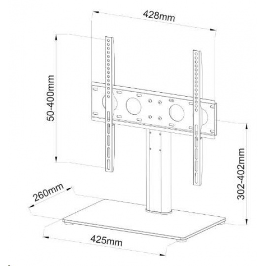 Elegantný stojan na TV 32-55", nastaviteľná výška, špičková kvalita, nosnosť 40 kg Vysokokvalitný stojan na TV a monitory s uhlopriečkou 32" až 55" a nosnosťou 40 kg. Základňa s rozmermi 425 x 260 mm je vyrobená z 8 mm hrubého čierneho bezpečnostného skla. Ostatné časti sú vyrobené z liatiny alebo ocele. Držiak podporuje štandardy VESA 100x100 až 400x400, má systém na upevnenie televízora. Nastavenie výšky od 302 do 402 mm (do stredu obrazovky). Systém na vedenie káblov, bezpečnostný kábel na ukotvenie do nábytku alebo stien, inštalačný materiál. Vynikajúca kvalita za bezkonkurenčnú cenu. ErgoSolid Castor 2 - elegantní podstava na televizi nebo monitor 32 až 55 palců Technické údaje: nosnost 40kg podporuje VESA standardy 100x100 až 400x400 doporučujeme na televizory a monitory s úhlopříčkou 32" až 55" nastavení výšky 302mm až 402mm systém vedení kabeláže podstava z bezpečnostího skla o rozměrech 425mm x 260mm x 8mm fixace Tv na držák bezpečností lanko pro uchycení k nábytku nebo zdi elegantní design vynikající kvalita instalační materiál barevné provedení černé záruka 2 roky Bezpečností lanko pro uchycení k nábytku nebo ke zdi ErgoSolid Castor 2 Fixace Tv na držák podstavce ErgoSolid Castor 2 Televizní podstavec ErgoSolid Castor 2 podporuje VESA standardy: VESA 100x100 VESA 200x100 a 100x200 VESA 200x200 VESA 300x100 a 100x300 VESA 300x200 a 200x300 VESA 300x300 VESA 400x200 a 200x400 VESA 400x300 a 300x400 VESA 400x400..