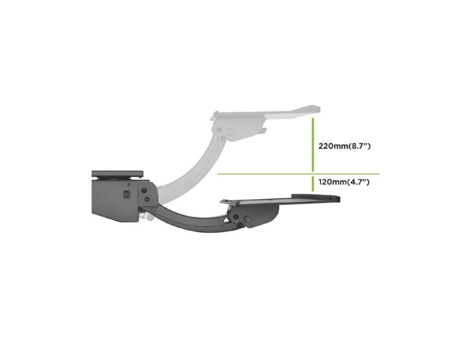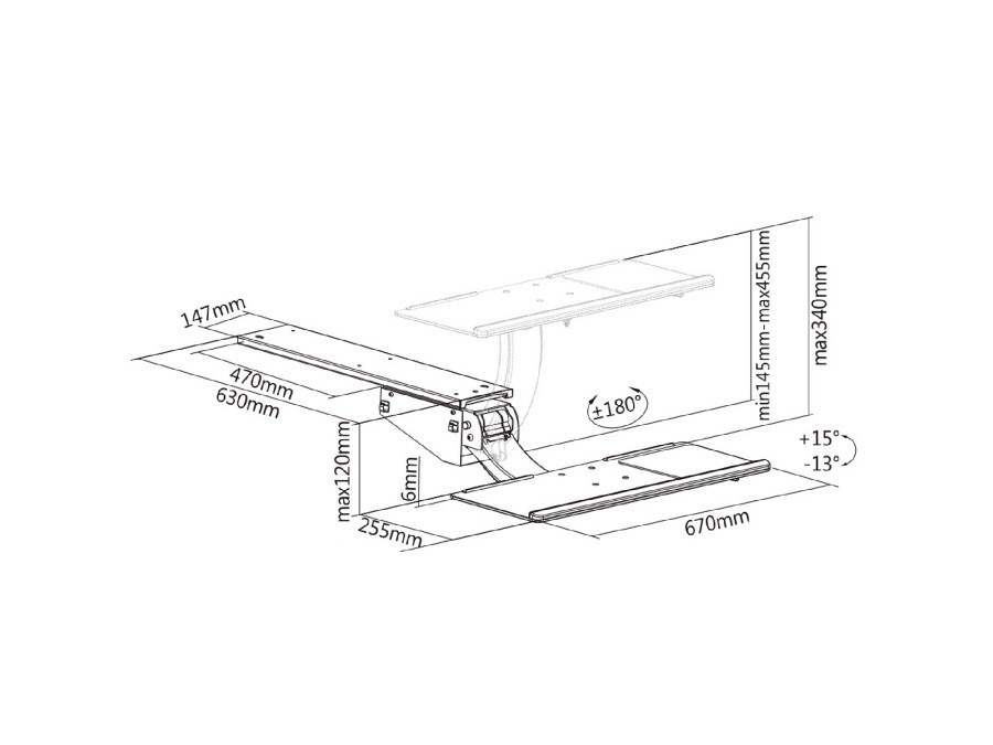 Polička na klávesnicu Fiber Mounts M7C95 Plne nastaviteľná doplnková polička na klávesnicu, rozmery 670x255mm Profesionálna plne nastaviteľná stolová doplnková polička na klávesnicu a myš, ktorá poskytuje skutočné ergonomické riešenie pre Vašu najpohodlnejšiu prácu. Nastavenie vo všetkých polohách s aretáciou. Ak požadujete to najlepšie a záleží Vám na zdravom pracovnom štýle, túto poličku si zamilujete. Profesionálna stolová polička na klávesnicu, plne nastaviteľná: vysúvacia, otočná, sklopná, výškové nastavenie 34cm, aretácia polohy - Fiber Mounts M7C95 Technické údaje: nosnosť 2kg výsuvná 470mm výškové polohovanie 340mm otáčanie +/- 180° rozsah naklápania +15 / -13° rozmery police 670 x 255 snadné schovanie poličky s klávesnicou pod stolovou doskou aretácia polohy najvyššia kvalita snadná inštalácia a ovládanie zvýšenie komfortu a pracovného výkonu farebné prevedenie čierne záruka 3 roky Precízne veľmi jednoduché nastavovanie poličky na klávesnicu Fiber Mounts M7C95 Ušetrite na svojom stole veľa miesta - dajte klávesnicu a myš na túto výsuvnú poličku a kedykoľvek ju môžete uschovať pod stolovou doskou. Polička je plne nastaviteľná a pri práci poskytuje vysoký komfort.