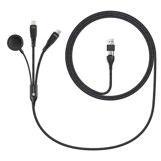 Univerzálny nabíjací kábel 6v1 pre nabíjanie zariadení s konektormi 1x USB-C, 1x Lightning a 1x nabíjačka na chytré hodinky (kompatibilná s Apple Watch) so vstupným konektorom USB-C a redukciou na USB-A. Umožňuje nabíjanie až troch zariadení súčasne s podporou rýchleho nabíjania pomocou max. prúdového toku 5 A. Špeciálna manžetová nadstavba konektorov zaručuje lepšiu dostupnosť k nabíjacím zásuvkám mobilných telefónov v puzdrá.