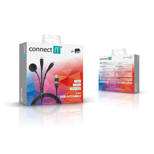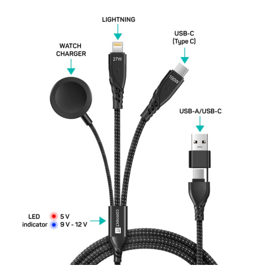 CONNECT IT Nabíjecí kabel Wirez 6v1, USB-C/USB, Lightning, Bezdrátová nabíječka na hodinky, 1.25m, černá
