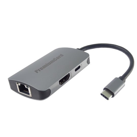 PREMIUMCORD Adaptér USB-C na HDMI + RJ45 + PD adaptér, hliníkové pouzdro