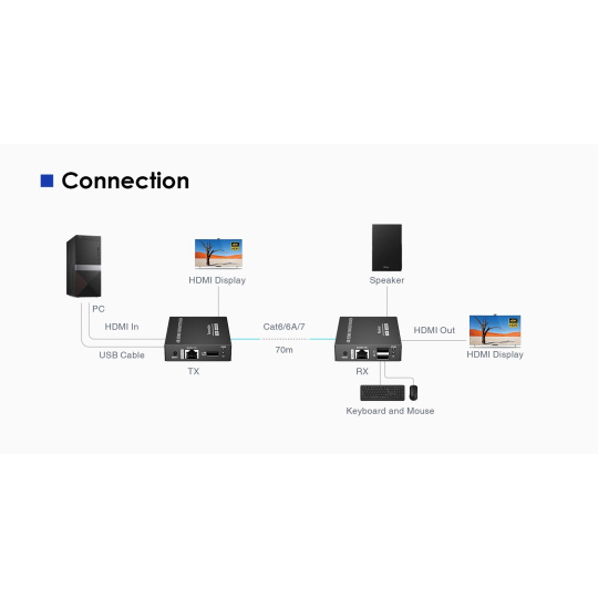 Umožňuje distribuovať HDMI signál s vysokým rozlíšením 4K@60Hz bez zpoždenia až na 70 metrov a zároveň prenášať USB (napríklad klávesnicu, myš alebo iné USB periférie)