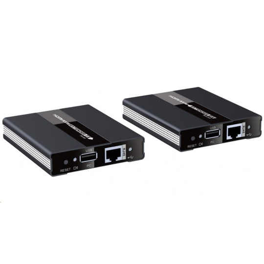 - Extender prenáša aj USB, vysielač má jeden USB na pripojenie k počítaču, prijímač má dva USB konektory na pripojenie napr. myši a klávesnice