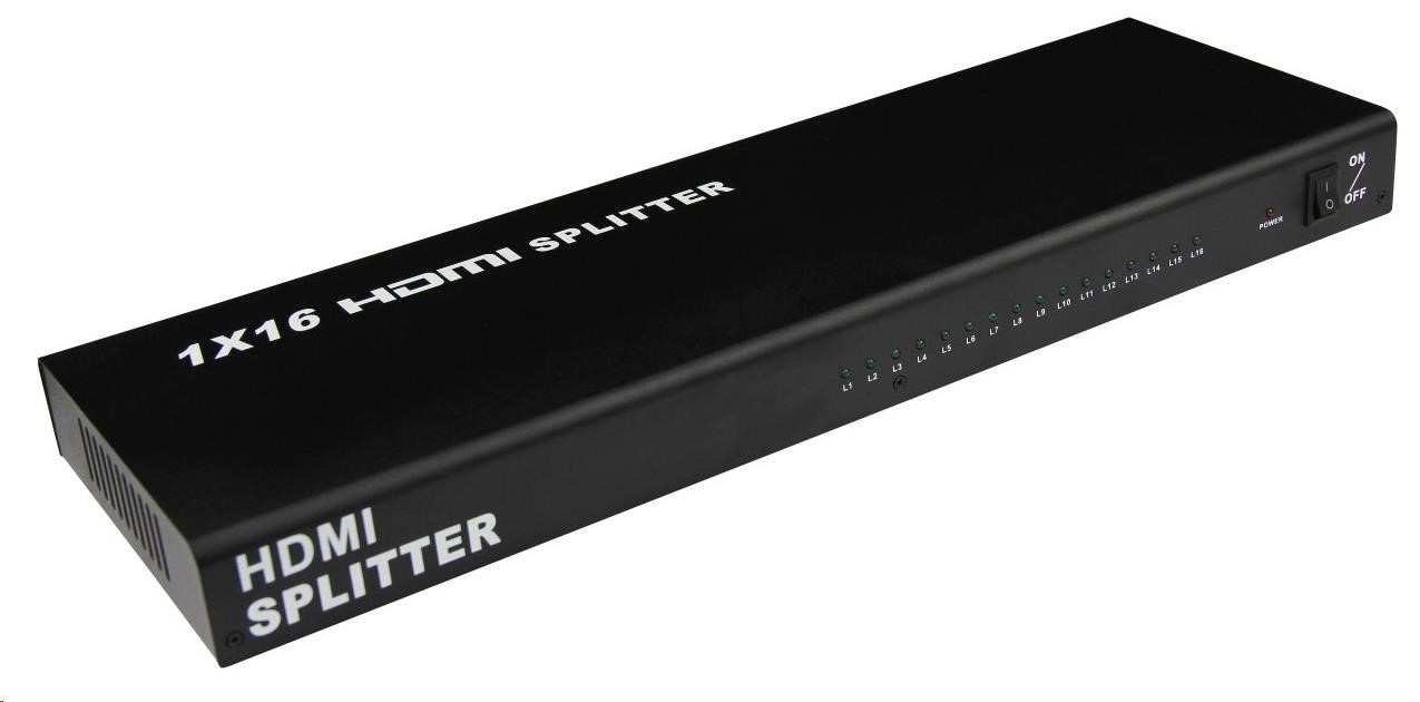 HDMI Video Splitter 1 => 16 s externým napájaním, HDMI 1.kompatibilné s 4a max. rozlíšenie 1080i a 1080p. K jednému zdroju signálu HDMI môžete pripojiť viacero obrazoviek HDMI. - kompatibilný s DTV 480i, 480p, 720i, 720p, 1080i a 1080p - podpora VGA, SVGA, XGA a UXGA - HDMI 1.4a - Podporuje Full 3D - HDCP ready - LED indikácia stavu - Napájací adaptér 230 V súčasťou balenia - Prenáša obraz aj zvuk - Podporuje až 15 m kábla HDMI na vstupe a 25 m kábla HDMI na výstupe. (zosilňuje signál HDMI) - kovový kryt pre lepší odvod tepla Ak sa obraz nezobrazí ihneď po zapojení rozbočovača, počkajte približne 30 s, kým sa signál rozpozná...