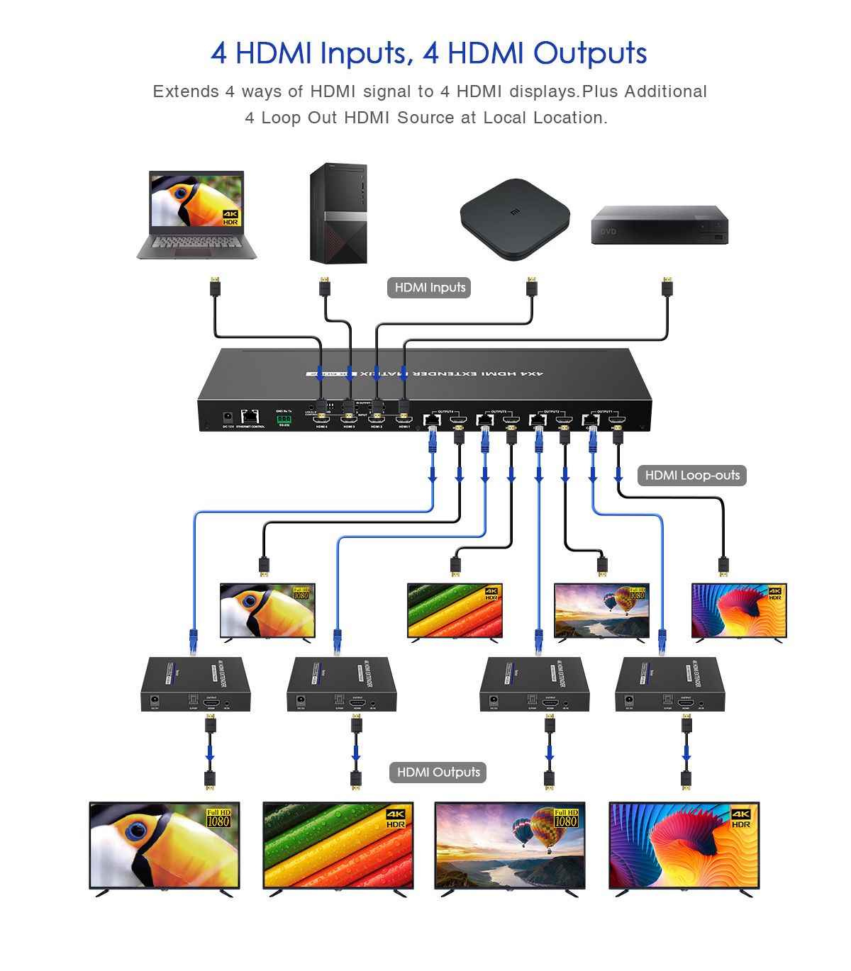 Umožní prepínať a prepojiť štyri zdroje HDMI signálu na 4 HDMI zobrazovacie zariadenia, monitory na veľkú vzdialenosť až 70m pomocou UTP kábla a navyše 4 lokálne monitory