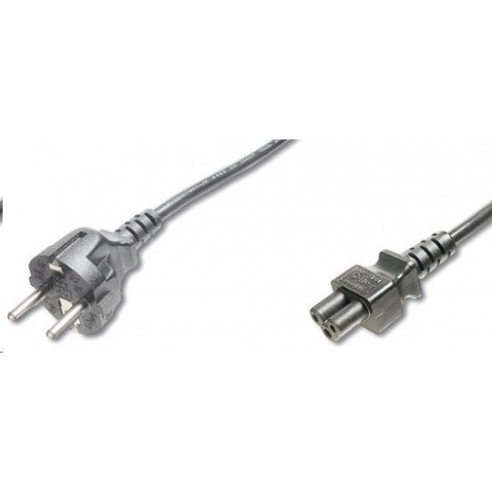 Napájací kábel v čiernej farbe pre notebook. Trojžilový kábel je ukončený zástrčkou typu "Mickey mouse" IEC 320 C5. Parametre a špecifikácie: - Prvý konektor: priama zástrčka cEE 7/7 230V - Druhý konektor: zásuvka IEC 320 C5 - Prierez vodičov: 3x0,75mm2 - Prúdové zaťaženie: max. 2,5A - Napätie max.: 250 V - Farba: čierna - Rovná koncovka - Dĺžka kábla: 2 m - Počet kusov v krabici: 50 ks..