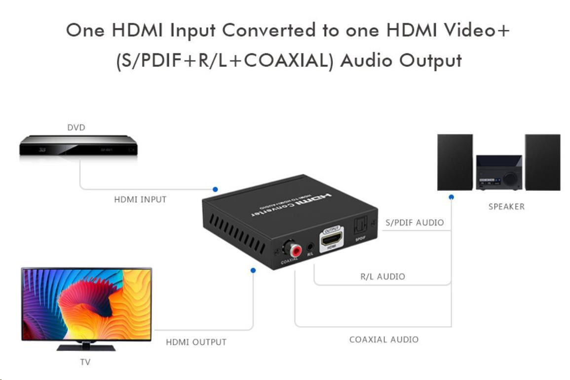 Umožňuje oddelenie zvuku z HDMI2.0 vstup na analógový/digitálny zvuk, ktorý je samostatne vyvedený do konektorov: stereo jack, digitálny audio RCA CINCH alebo digitálny optický TOSLINK (SPDIF)