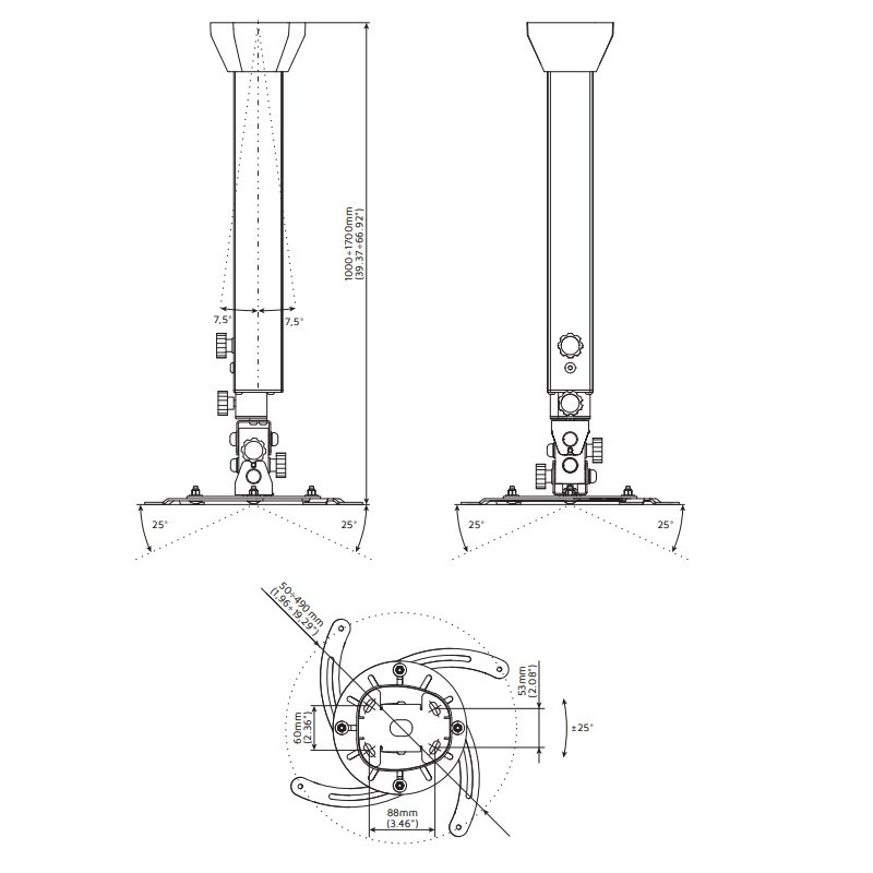 Profesionálny dizajnový stropný držiak na projektor EDBAK PMV300 Stropný držiak na zavesenie projektora s hmotnosťou do 15kg, najvyššia kvalita, dizajn, nastaviteľnosť 100-170cm Ne vždy je možné použiť obyčajný stropný držiak na projektory, niekedy je nutné použiť držiaky najvyššej kvality a krásneho dizajnu. My vám takéto držiaky na projektory ponúkame. Komplexná rada profesionálnych stropných držiakov na projektory v nádhernom dizajnovom prevedení. Držiaky sú plne nastaviteľné, vhodné pre 99% dostupných projektorov a dataprojektorov. Farebné prevedenie čierne alebo biele. Záruka 5 rokov. Ak vám záleží na dizajne rovnako ako na kvalite, ste na správnej stránke. Profesionálny stropný držiak projektora s nastaviteľnou dĺžkou, otočný a sklopný, najvyššia kvalita Edbak PMV300Dĺžkovo nastaviteľný stropný držiak na projektor Edbak PMV300 Technické údaje: nosnosť 15kg univerzálny držiak pre uchytenie 99% dostupných projektorov na projektory s 3 alebo 4 otvormi pre uchytenie rozteč otvorov pre uchytenie v rozmedzí 50-490mm dĺžkové nastavenie 1000mm až 1700mm otáčanie do strán +/- 360° náklon do strán +/- 25° náklon nahor a nadol +/- 25° korekcia roviny obrazu korekcia nerovnosti stropu +/- 7,5° zaistenie v požadovanej pozícii systém pre skryté vedenie káblov najvyššia kvalita - profesionálne prevedenie nádherný dizajn biele alebo čierne prevedenie záruka 5 rokov Profesionálne stropné držiaky Edbak PMV sú dĺžkovo nastaviteľné, otočné a sklopné, najvyššia kvalita a krásny dizajn Na stropný držiak s nastaviteľnou dĺžkou 100-170cm EDBAK PMV300 je možné uchytiť všetky projektory, ktoré majú 3 alebo 4 otvory so závitom s roztečou 50mm až 490mm. Vďaka najvyššej kvalite a profesionálnemu prevedeniu sú držiaky EDBAK rady PMV vhodné naozaj kamkoľvek.