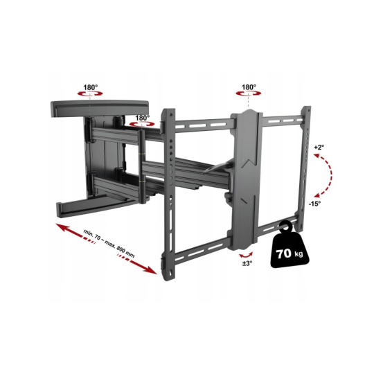 Profesionálny držiak TV Fiber Novelty Noston Profesionálny nástenný držiak na TV 43-90", otočný, sklápací, dĺžkové nastavenie, korekcia roviny, vedenie káblov, krásny dizajn a špičková kvalita, VESA štandardy 200x100 až 600x400, nosnosť 70kg Plne nastaviteľný držiak na všetky typy televízorov s uhlopriečkou 43" až 90", ktorý je v krásnom dizajne a zároveň poskytuje naozaj EXTRA pevné a bezpečné zavesenie televízorov s hmotnosťou až 70kg. Aj pri tejto záťaži môžete každú zavesenú televíziu vysunúť od steny od minimálnej dĺžky 70mm až po neuveriteľných 800mm. Tento držiak v dĺžkovom nastavení predčí takmer všetky držiaky, pritom za zlomok ceny týchto držiakov. Televíziu môžete otáčať do strán a naklápať. V prípade nepresnej inštalácie má držiak systém na korekciu roviny obrazovky. Polohovanie je jednoduché a zvládnu to aj deti, pričom budete mať vždy istotu úplnej bezpečnosti aj pri najväčších a naozaj ťažkých televízoroch. Ramena držiaka sú osadené krytkami pre vedenie káblov. V balení nájdete aj montážny materiál. Farebné prevedenie čierne. Záruka 5 rokov. Profesionálny držiak na televízie v najvyššej kvalite a špičkovom prevedení Technické údaje: nosnosť 70kg podpora VESA štandardu 200x100 až 600x400 odporúčame na TV s uhlopriečkami 43" až 90" nastavenie vzdialenosti od steny 70-800mm otáčanie TV do strán +/-75° možnosť náklonu obrazovky + 2° až - 15° korekcia roviny obrazovky + 3° až -3° systém na vedenie káblov extrémne pevná a spoľahlivá konštrukcia najvyššia bezpečnosť veľmi pekný dizajn profesionálny polohovateľný držiak na televízie farebné prevedenie čierne montážny materiál súčasťou balenia záruka 5 rokov Profesionálny otočný sklápací a výsuvný držiak na televízie Fiber Novelty Noston Televízny držiak Fiber Novelty Noston podporuje VESA štandardy: VESA 200x100 VESA 200x200 VESA 300x100 a 100x300 VESA 300x200 a 200x300 VESA 300x300 VESA 400x200 a 200x400 VESA 400x300 a 300x400 VESA 400x400 VESA 600x400 Bezpečné a spoľahlivé zavesenie všetkých typov televízorov s uhlopriečkou 43 až 90 palcov (94 až 230cm) a to aj pri maximálnej záťaži 70kg a maximálnom vysunutí obrazovky od steny na vzdialenosť 80cm. Pre zabezpečenie bezpečnosti je nutné naozaj spoľahlivé ukotvenie držiaka do steny.