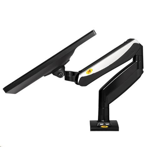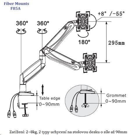 Profesionálny kancelársky držiak LCD monitoru Fiber Mounts F85A Kancelársky držiak na PC monitory 19÷32", nastavenie výšky, otáčanie, náklon, rotácia, korekcia roviny, 2 typy uchytenia na stolovú dosku, USB konektory, systém vedenia kábláže Profesionálny stolový držiak na uchytenie a polohovanie PC LCD monitorov s uhlopriečkou 19 až 32 palcov. Držiak vám umožní 3D polohovanie obrazovky monitora: otáčanie do strán, náklon, nastavenie vzdialenosti od stolového uchytenia, výšková polohovateľnosť, rotácia monitora. Držiak je osadený USB konektormi a má systém pre vedenie kábláže. V balení nájdete 2 typy uchytenia na stolovú dosku o priemere až 90mm: na okraj stolu alebo do priestoru stolu. Držiak podporuje VESA štandardy 75x75 a 100x100, v prípade potreby je možné dokúpiť rozšírenie na 200x100 alebo aj 200x200. Zavesiť môžete všetky monitory a televízory s hmotnosťou 2 až 8kg. Výšková polohovateľnosť je zabezpečená plynovým piestom s nastaviteľnou tuhosťou - jednoduchá regulácia. Profesionálna kvalita a krásny dizajn držiaku Fiber Mounts F85A umožní použitie v firmách, kanceláriách, pracovniach, ale aj domácnostiach a detských izbách. Technické údaje: zaťaženie 2÷8kg podporuje VESA štandardy 75x75 a 100x100 možnosť rozšírenia VESA na 200x100 alebo 200x200 odporúčame na monitory a televízory s uhlopriečkou 19 až 32" otáčanie do strán +/-90° náklon: nahor +55°, nadol -8° celková výška 500mm výšková polohovateľnosť v rozmedzí 295mm maximálna vzdialenosť od stolového uchytenia 572mm funkcia PIVOT - rotácia monitora, nastavenie horizontálnej alebo vertikálnej polohy monitora korekcia roviny monitora integrované USB konektory súčasťou balenia 2 typy uchytenia na stolovú dosku: na okraj stolu alebo do priestoru profesionálna kvalita ľahká nastaviteľnosť krásny dizajn záruka 2 roky Kancelársky držiak na LCD monitory Fiber Mounts F85A podporuje VESA štandardy: VESA 75x75 VESA 100x100 možnosť dokúpiť rozšírenie VESA 200x100 možnosť dokúpiť rozšírenie VESA 200x200