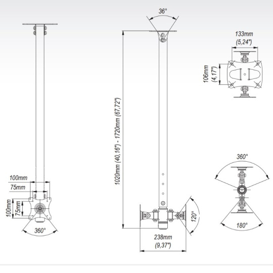 EDBAK SV35 stropné držiak na 2 monitorky Profesionálny stropný držiak na 2 obrazovky 17-43", výškové nastavenie, otáčanie, náklon Špičkový stropný držiak na zavesenie 2 televízorov alebo monitorov. Držiak umožňuje dĺžkové nastavenie, nezávislé otáčanie jednotlivých obrazoviek a ich naklonenie. Profesionálna konštrukcia. Dodávame v čiernom alebo striebornom prevedení. Záruka 5 rokov. Profesionálny stropný držiak na 2 obrazovky, nastavenie dĺžky, otáčanie, náklon - EDBAK SV35 Technické údaje: max. zaťaženie 30kg podporuje VESA štandardy 75x75 a 100x100 možnosť rozšírenia VESA na 200x100 alebo 200x200 vhodné na monitory a Tv 17" až 43" minimálna dĺžka držiaku 1020mm maximálna dĺžka držiaku 1720mm nastavenie dĺžky podľa potreby v uvedenom rozmedzí nezávislé otáčanie každého monitoru v rozmedzí +90° / -90° nezávislé naklonenie každého monitora v rozmedzí +60° / -60° možnosť uchytenia držiaku na zvislé stropné konštrukcie 0° až 18° korekcia roviny obrazoviek horizontálne aj vertikálne otočenie obrazoviek - funkcia PIVOT bezpečné zavesteňie 2 obrazoviek profesionálna konštrukcia farba čierna alebo strieborná záruka 5 rokov Stropný držiak na 2 obrazovky EDBAK SV35 podporuje VESA štandardy: VESA 75x75 VESA 100x100 VESA 200x100 za príplatok VESA 200x200 za príplatok