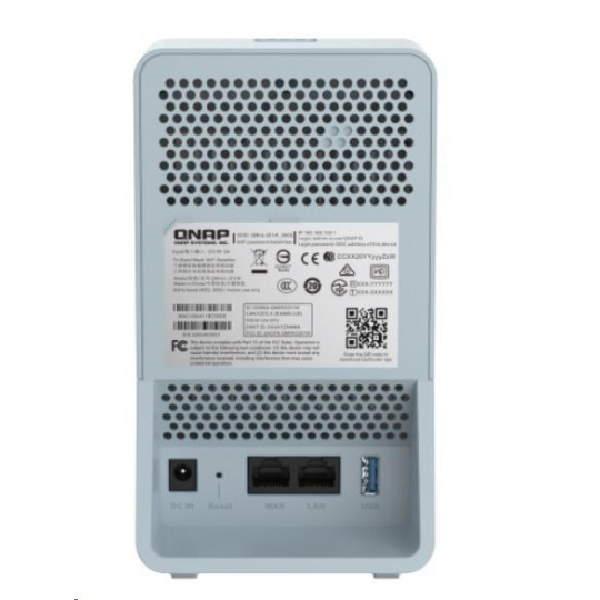 Pouze na pripojenie USB donglu úložiska pre FTP službu na smerovačiBluetooth Verzia 5 Zisk antény Bluetooth 2,3dBi Tlačidlo Reset, WPS Napájanie 12 V DC Spotreba energie 24 W Rozmery 68x100x175,5 mm Hmotnosť 0,44 kg Hmotnosť balenia 1,11 kg Prevádzková teplota 0°C ~ +40°C Prevázková vlhkosť 5 až 95 % bez kondenzácie Certifikácia JATE / CE / FCC / BSMI / NCC / IC / SRRC / VCCI / RCM / OFCA Wi-Fi Mesh ✓ (se trípásmovou) Riešenie QNAP SD-WAN, QuWAN ✓