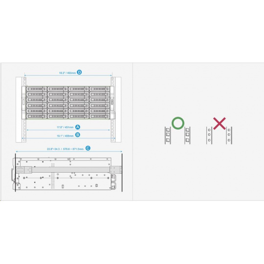 - Vzdialenosť medzi dvoma rackovými stĺpmi (meranie štvorecových otvorov racku stred-stred) je 18,3" (465 mm)