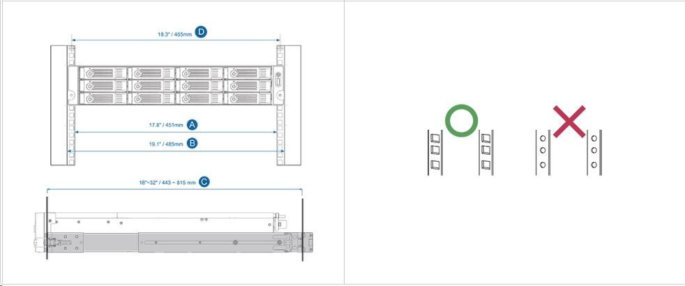- Vzdialenosť medzi dvoma rackovými stĺpmi (meranie štvorcových otvorov racku stred-stred) je 18,3"(465 mm)