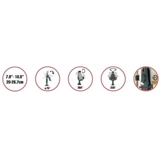 Bezpečnostní uchycení pro tablety 7,9-10,5" na stůl a na stěnu. Nastavitelný sklon tabletu rozmezí +70/-70° a navíc otočný 360°, fixace vruty ke stolu - 330° otočné kolem osy, hmoždinky do zdi, ocelové lanko proti odcizení, kabelový prostup, černý..