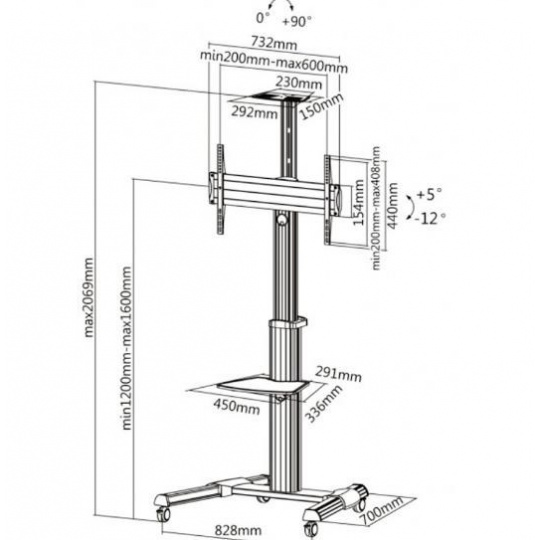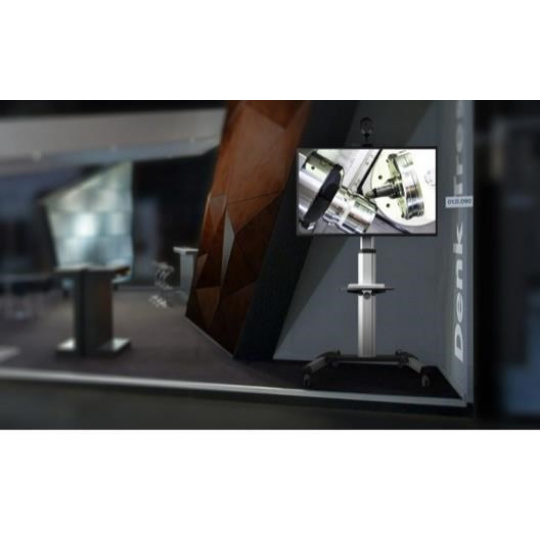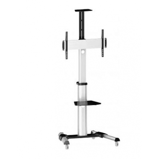 Moderní televizní stolek na Plasma a LCD TV s uhlopříčkou 37"- 70" (94-178cm) a hmotností maximálně 50kg. Středová teleskopická nosná tyč na kolečkách, držák otočný o 90° a vertikálně výklopný +5°/-12°, horní výškově nastavitelná plocha pro kameru, polička, AluDesign, barva stříbrná. Uchycení VESA: 200x200, 300x300, 400x200, 400x400, 600x400..