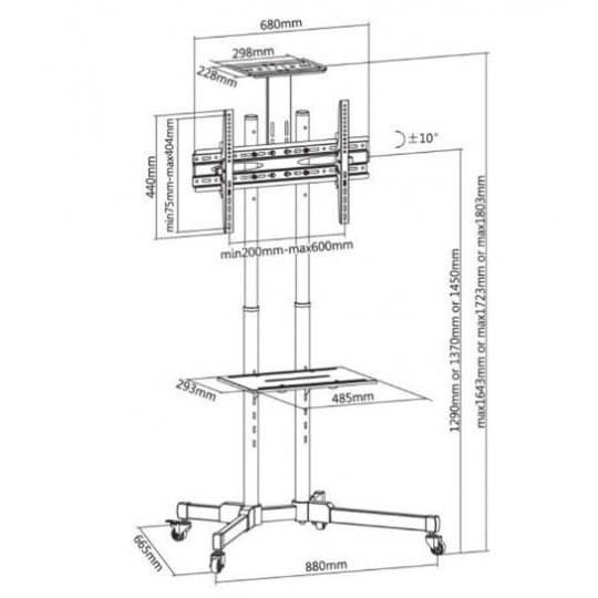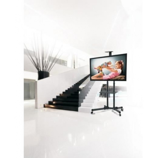 Televizní stolek na Plasma a LCD TV s uhlopříčkou 37"- 70" (94-178cm) a hmotností maximálně 50kg. 2x středová nosná tyč na kolečkách, držák vertikálně výklopný +10°/-10°, horní výškově nastavitelná plocha pro kameru, polička, materiál ocel, barva černá. Uchycení VESA: 200x200, 300x300, 400x200, 400x400, 600x400..