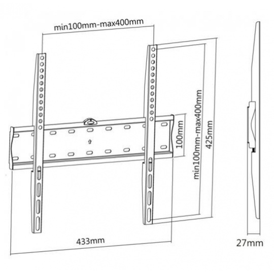 Nástěnný ocelový držák SLIM s minimální vzdáleností od stěny na Plasma a LCD TV s uhlopříčkou 32"- 55" (81-140cm) a hmotností maximálně 40kg. Středová konzole na zavěšení TV s upevněnými držáky, není vertikálně výklopný, vzdálenost od stěny 27mm, vodováha, materiál ocel, barva černá. Uchycení VESA: 200x200, 300x300, 400x200, 400x400..