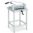 Pohodlné rezanie až do formátu A3, dĺžka rezu 430 mm, hĺbka vkladania stohu 435 mm. Stroj má integrovanú sadu bezpečnostných prvkov SCS. "Bezpečnostný systém rezania", ktorý zahŕňa: priehľadný bezpečnostný kryt na prednom stole, aretáciu nožov (páka v najvyššej polohe), jednoduchú a bezpečnú výmenu nožov spredu bez nutnosti demontáže krytov nožov, pomôcku na výmenu nožov s ochranným krytom, nastavenie hĺbky zárezu noža (zvonka), jednoduché otáčanie/výmena reznej lišty (zvonka). Podstavec je voliteľné príslušenstvo. Rozmery bez podstavca (vxšxh): 400 × 880 × 880 mm, hmotnosť 44 kg...