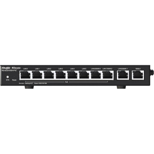 Popis produktu Ruijie RG-EG310GH-P-E je kabelový Gigabitový router s PoE, dostatečným VPN výkonem pro obsloužení poboček a vzdáleně pracujících pracovníků v rámci firmy. Bezpečný a spolehlivý router s vlastním webovým managementem, možností správy přes Ruijie Cloud odkudkoliv, blokování obsahu podle typu aplikace, inteligentní Multi-WAN load balancing s možností využít až 4 WAN porty zároveň. Router nabízí 1 Gigabitovými WAN port, 6x Gigabit LAN, 3 Gigabitový LAN/WAN porty, celkový výkon v NATu 1.5 Gbps a 802.3af/at PoE na prvních 8 portech s celkovým PoE budgetem 130W. Router pro přístup do lokální sítě umožňuje i několik možností VPN serverů a to konkrétně: IPsec, PPTP, L2TP a OpenVPN. Limity VPN • IPsec: 230 Mbps, max. 64 tunelů • L2TP: 640 Mbps, max. 64 tunelů • OpenVPN: 100 Mbps, max. 64 tunelů Obsah balení • Zařízení • Napájecí adaptér 52V / 2.4A • Napájecí kabel Technické parametry Konektory a rozhraní Rychlosti WAN:(1) 10/100/1000Mbps Možnost více WAN:Ano Rychlost LAN:(6) 10/100/1000Mbps + (3) 10/100/1000Mbps LAN/WAN Gigabit LAN:Ano Napájení Typ napájení:DC konektor Typy PoE:PoE-Out (pouze) Podporované PoE-Out standardy:802.3af, 802.3at Počet PoE Out portů:8 PoE budget [W]:110 Max. spotřeba energie [W]:130 Napájení přes konektor/svorkovnici:54V / 2,4A Fyzické charakteristiky Provedení:Desktop Ventilátory:Bez ventilátoru Šasi:Kovové Tlačítka:Reset Provozní teplota [°C]:0 až 40 Šířka [mm]:202 Výška [mm]:28 Hloubka [mm]:108 Hardware Frekvence CPU [MHz]:1350 Počet CPU jader:2 Obecné Propustnost NAT [Mb/s]:1500 Propustnost VPN IPsec VPN [Mb/s]:230 Software Podporované VPN:PPTP, L2TP, IPSec, OpenVPN Web management:Ano Management:Webové rozhraní, Ruijie cloud Podpora IPv6:Ano Výchozí IP adresa:192.168.110.1 Výchozí jméno a heslo:Nastavuje se při prvním spuštění.