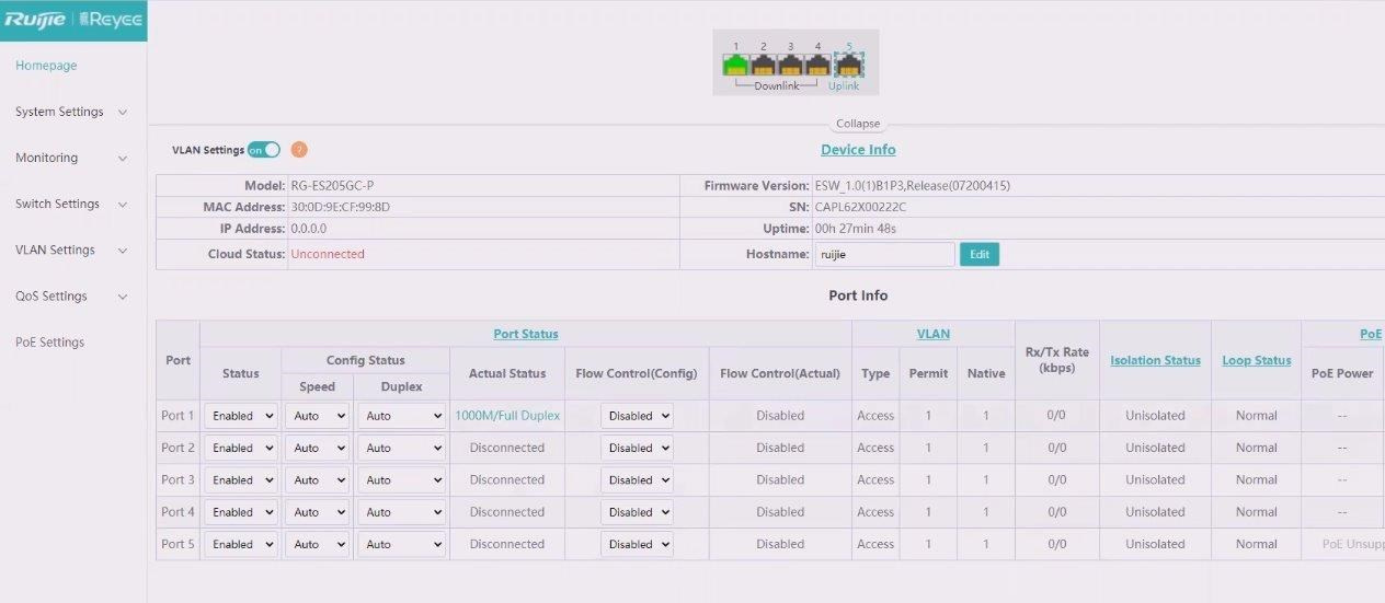 Popis produktu Inteligentní cloudově i přes webové rozhraní spravovatelný smart desktop switch RG-ES208GC od značky Ruijie, nabízí cenově efektivní řešení s 8 Gigabit LAN porty. Tento kompaktní přepínač je ideální pro síťové aplikace, které vyžadují výkon a spolehlivost. Co se výčtu funkcí týče, switch nabízí tichý chod bez ventilátorů, podporu až 16 VLAN, DHCP snooping, testování kabelu a ochranou proti zakruhování. Klíčové vlastnosti • 8× 10/100/1000 Mbps LAN porty • Kvalitní provedení, kovové šasi • Bez venilátoru • Nízká spotřeba - max. 4 W • Správa přes webové rozhraní a cloud • Celoživotní správa na Ruijie Cloud kdykoli a kdekoli • Rozpoznávání IP kamer - jedinečná hodnota pro CCTV síť • Automatická prevence proti zakruhování Obsah balení • Zařízení • Napájecí adaptér 5 V/1 A Technické parametry Konektory a rozhraní Rychlost LAN:(8) 10/100/1000Mbps Napájení Typ napájení:DC konektor Max. spotřeba energie [W]:4 Napájení přes konektor/svorkovnici:5V / 1A Fyzické charakteristiky Provedení:Desktop Ventilátory:Bez ventilátoru Šasi:Kovové Tlačítka:Reset Provozní teplota [°C]:0 až 40 Šířka [mm]:160 Výška [mm]:24 Hloubka [mm]:75 Obecné Rychlost přepínání [Gbps]:16 Tabulka MAC adres:4000 Rychlost předávání paketů [Mpps]:11,9 Software Web management:Ano Management:Webové rozhraní, Ruijie cloud Funkce:VLAN, DHCP snooping Výchozí IP adresa:10.44.77.200 Výchozí jméno a heslo:Nastavuje se při prvním spuštění.
