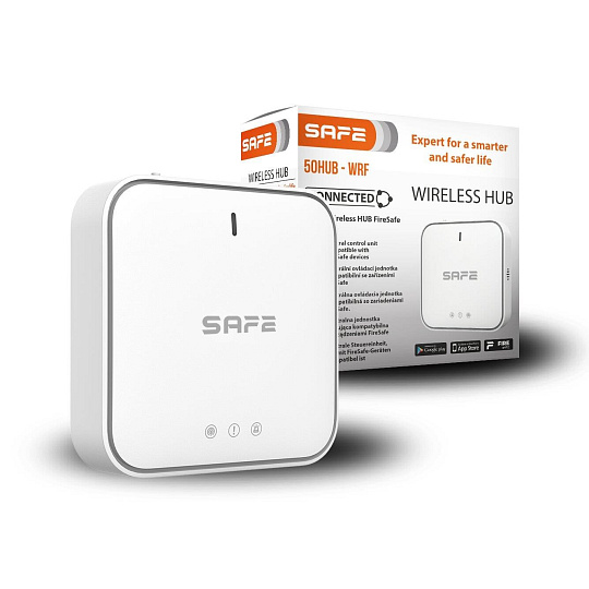 Centrální ovládací jednotka SAFE 50HUB – WRF je srdcem a současně řídícím prvkem bezpečnostního systému FireSAFE. Díky připojení do internetu umožňuje pohodlnou konfiguraci a ovládání jednotlivých částí systému FireSAFE. To vše i vzdáleně pomocí intuitivní stejnojmenné mobilní aplikace (pro Android i iOS) určené pro chytré telefony, tablety a další zařízení. Hub monitoruje činnost všech připojených senzorů a zařízení FireSAFE CONNECTED, a v případě zjištění nebezpečí okamžitě informuje uživatele systému formou poplachu a alarmových push notifikací v aplikaci FireSAFE.