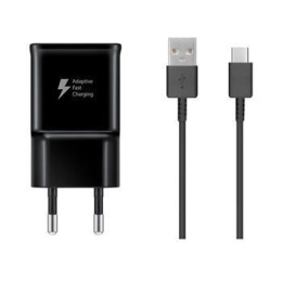 Samsung cestovní nabíječka do sítě s USB výstupem a maximálním výkonem 15W a USB-C nabíjecím kabelem.