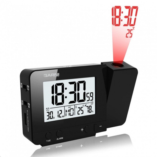 Digitálny budík s projekciou času a vnútornej teploty s LCD displejom, časom riadeným rádiovým signálom DCF-77 a meraním vnútornej teploty a relatívnej vlhkosti LCD displej o rozmere 63 x 42 mm s možnosťou stálého osvetlenia pri napájaní sieťovým adaptérom, alebo krátkodobým osvetlením na 8 s pri napájaní batériami 3 stupne jasu osvetlenia displeja, možnosť vypnutia osvetlenia displeja (pri napájaní sieťovým adaptérom) veľkosť číslic na displeji – čas 25 mm, dátum, skratka názvu dňa, vnútorná teplota a rel. vlhkosť 8,5 mm čas a dátum riadené signálom DCF-77 s možnosťou manuálneho nastavenia ikona príjmu signálu DCF-77 skratka názvu dňa 12-hodinový alebo 24-hodinový formát zobrazenia času možnosť nastavenia časového pásma od -12 do +12 hodín budík s 2 budícími časmi s funkciou opakovaného bdenia (Snooze) po 5 minútach budící signál - 10 sekúnd 1 pípnutie za sekundu, 10 sekúnd 2 pípnutia za sekundu, 10 sekúnd 4 pípnutia za sekundu a potom stály pípací zvuk projekcia času a vnútornej teploty s možnosťou otočenia obrazu o 180°, možnosť sklopenia tubusu projektora o 90° dopredu a dozadu farba projekcie červená stále projekcie pri napájaní sieťovým adaptérom s možnosťou vypnutia zobrazenie hodnôt vnútornej teploty a relatívnej vlhkosti zobrazenie teploty vo °C, alebo °F USB port na nabíjanie mobilných zariadení (len pri napájaní hlavnej jednotky sieťovým adaptérom), maximálny nabíjací prúd 1 000 mA napájanie sieťovým adaptérom, alebo batériami možnosť postavenia farba čierna Obsah balenia: 1 x digitálny budík GARNI 140 1 x sieťový adaptér český, slovenský, nemecký, anglický, taliansky, poľský a maďarský návod