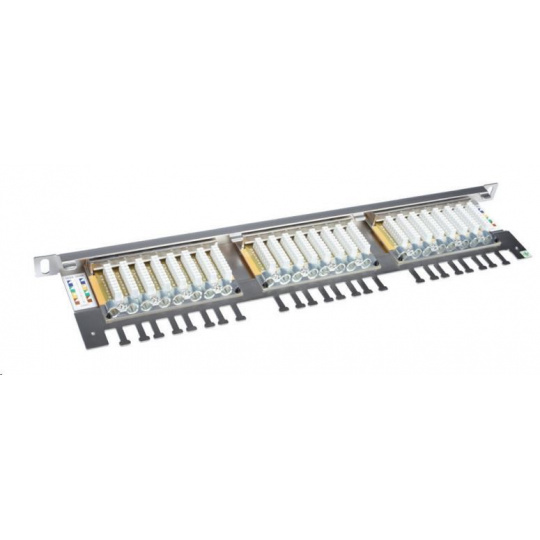 Vysokohustotný 0,5U tienený patch panel CAT6 s 24 portmi a viazacou lištou.