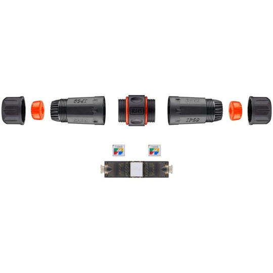Tienená vodotesná spojka pre rozvod Cat5e/6/6a. Určené na predĺženie segmentov koncovo pripojených káblov. Vhodný nástroj pre vonkajšiu inštaláciu aktívnych vonkajších prvkov a ich jednoduchú montáž a demontáž na ťažko dostupných miestach.