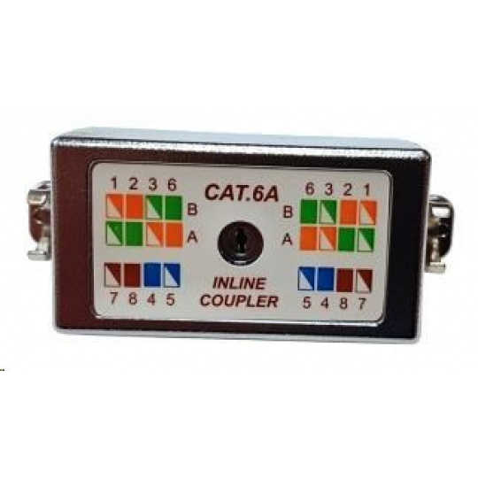 Prepojovací box Cat6A, stínený pokovovaním. Umožňuje prepojiť káblové segmenty bez straty kvality vedenia. Narážacie kontakty.
