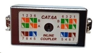 Prepojovací box Cat6A, stínený pokovovaním. Umožňuje prepojiť káblové segmenty bez straty kvality vedenia. Narážacie kontakty.