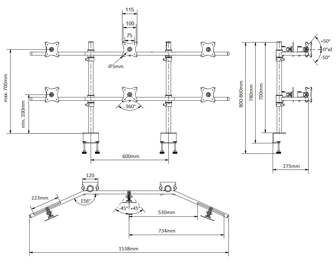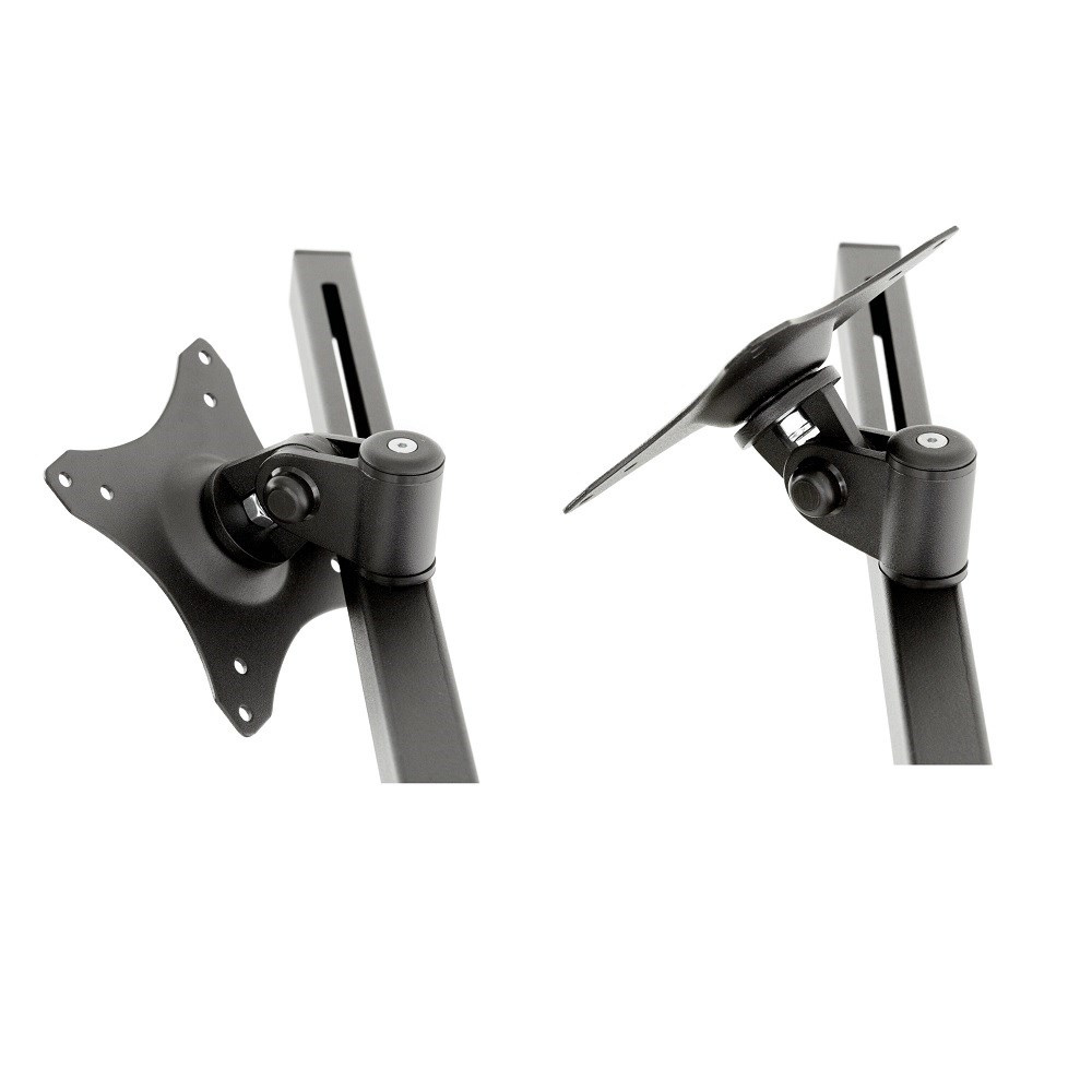 Stolný držiak na 6 monitorov Edbak SV17 Stolný držiak na 6 monitorov alebo televízorov s uhlopriečkou 17"-27", parabola, plne nastaviteľné polohy monitorov, profesionálna kvalita, VESA štandardy 75x75 a 100x100, farba čierna, nosnosť 60kg Profesionálny parabolický stolný držiak na 6 monitorov 17-27". Nastaviteľná poloha každého monitora podľa potreby: otáčanie do strán, naklápanie, korekcia roviny, pivot, posun do strán. Nastavenie potrebnej výšky vodorovných nosníkov s monitormi. V balení nájdete 2 typy stolových úchytov: svorky na uchytenie na okraje stolov alebo šroubovicu na uchytenie do prechodiek. Systém vedenia káblov. Najvyššia kvalita, silnostenný materiál. Podpora VESA štandardov 75x75 a 100x100, farebné prevedenie čierne, nosnosť 60kg. Záruka 10 rokov. Profesionálny stolný držiak na 6 monitorov v parabole Edbak SV17 Technické údaje: nosnosť 60kg na monitory s uhlopriečkou 17" až 27" VESA štandardy 75x75mm a 100x100mm polohovanie vzdialenosti monitorov medzi sebou 223mm nastavenie sklonu +/- 50° otáčanie monitora do strán +/-45° funkcia pivot uchytenie na stolové dosky o hrúbke 10-55mm (prechodka) alebo 10-80mm na okraj stola najvyššia kvalita, silnostenný materiál, profesionálny výrobok veľmi jednoduchá a rýchla montáž farba čierna záruka 10 rokov Držiak na 6 monitorov displejov Edbak SV17 Stojan na 6 monitorov Edbak SV17 podporuje VESA štandardy: VESA 75x75 VESA 100x100 možnosť zakúpenia rozšírenia na VESA 200x100 a 100x200 možnosť zakúpenia rozšírenia na VESA 200x200