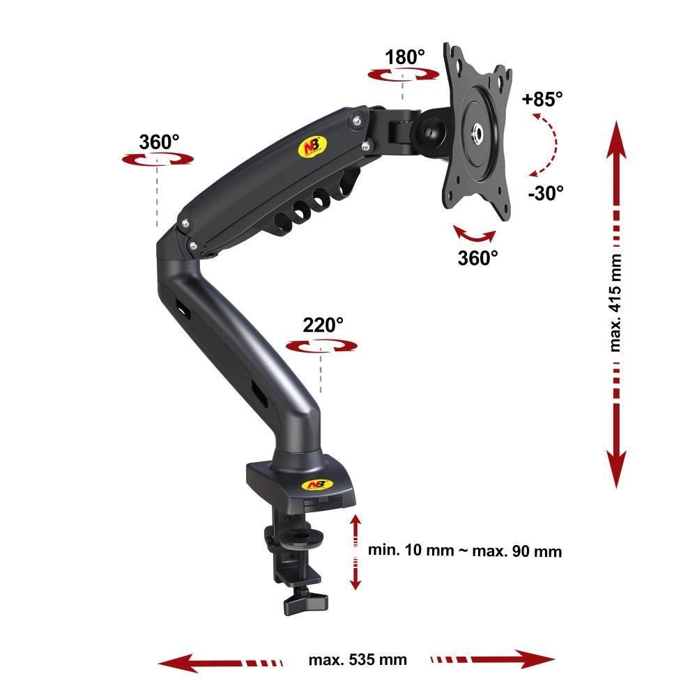 Stolový kancelársky držiak monitora NB F80B Profesionálny držiak monitorov 17-30", plne nastaviteľný, krásny dizajn, VESA 75x75 a 100x100, výškové polohovanie, nosnosť 9kg Vynikajúci stolový držiak na monitory, prípadne menšie televízory 17-30" v profesionálnej kvalite, s pekným dizajnom a s mnohými nadštandardnými možnosťami nastavenia. Otáčanie obrazovky do strán, náklon nahor aj nadol v širokom rozmedzí, nastavenie vzdialenosti od uchytenia až 535mm, korekcia roviny obrazovky, horizontálne alebo vertikálne otočenie obrazovky pivot, systém pre skryté vedenie káblov. Výškové nastavenie obrazovky v rozmedzí až 260mm vďaka plynovému piestu - veľmi jednoduchá zmena výšky iba stlačením alebo vytlačením monitoru. To všetko v jedinečnom dizajne. Držiak má veľmi odolnú a bezpečnú konštrukciu a je vhodný aj do veľmi vyťažených prevádzok, kde je potrebná neustála manipulácia s monitorom. Stolový držiak monitora do kancelárie, prevádzky alebo domácnosti - držiak NB F80B Technické údaje: nosnosť 9kg (minimálna hmotnosť obrazovky 2kg) podporuje VESA štandardy 75x75 a 100x100 odporúčame na monitory a televízory s uhlopriečkou 17" až 30" otáčanie na obe strany +135° až -135° výšková regulácia v rozmedzí 260mm maximálna výška 415mm veľká uhlová nastaviteľnosť náklonu +85° až -30° regulácia vzdialenosti od uchytenia na stole 0mm až 535mm horizontálne aj vertikálne otočenie obrazovky funkciou pivot korekcia roviny obrazovky veľmi jednoduchá nastaviteľnosť jediným prstom systém pre skryté vedenie káblov profesionálny držiak vysokej kvality, odolná a bezpečná konštrukcia vhodný aj pre každodenné polohovanie monitora 2 typy uchytenia na stolovú dosku (na okraj alebo do priestoru cez otvor) záruka 3 roky Stolový držiak na monitor s úplným polohovaním NB F80B Kancelársky stolový držiak NB F80B podporuje VESA štandardy: VESA 75x75 VESA 100x100 možnosť rozšírenia na 200x100 za príplatok možnosť rozšírenia na 200x200 za príplatok Stolový držiak do kancelárií v najvyššej kvalite a krásnom dizajne, široká škála polohovania NB F80B Vďaka profesionálnej kvalite, odolnej konštrukcii, plnej nastaviteľnosti a peknému dizajnu je držiak vhodný: domácnosti, detské izby pracovne, kancelárie, prevádzky, obchody štátne inštitúcie - školstvo, nemocnice, zasadacie sály, prezentačné priestory, konferenčné sály firem a podnikov Stolový držiak na monitor NB F80B je možné použiť aj na väčšie monitory než 30", podmienkou je maximálna hmotnosť 9kg a podpora VESA štandardu 75x75 a 100x100 (za príplatok je možné zakúpiť aj rozšírenie na 200x100 a 200x200). U monitorov a televízorov s uhlopriečkou nad 30" už nebude možné vertikálne otočenie obrazovky, iba horizontálne.