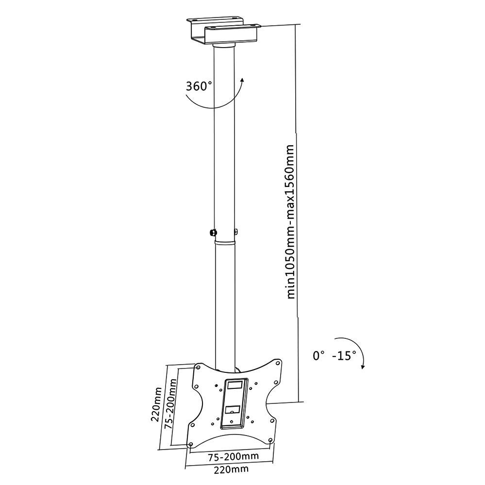 Držiak na televízie a monitory Fiber Novelty C200 Stropný držiak na zavesenie televízorov a monitorov 23" až 50", nastavenie dĺžky 105-156cm, otočný, sklopný, VESA 75x75 až 200x200, nosnosť 50kg Kvalitný stropný držiak, ktorý je vhodný na menšie a stredne veľké televízory a monitory s uhlopriečkou 23" až 50". Držiak poskytuje širokú škálu nastavení - vzdialenosť od stropu v rozmedzí 105 - 156cm, otáčanie do strán a náklon. Montáž je veľmi jednoduchá a rýchla, zavešenie televízora je veľmi bezpečné. Držiak umožňuje skryté vedenie káblov vo vnútri nosnej konštrukcie. Súčasťou balenia je montážny materiál - skrutky, vruty, hmoždinky. Nastaviteľná výška stropného držiaka na TV a monitory FN-C200 Technické údaje: maximálne zaťaženie 50kg VESA štandard 75x75, 100x100, 200x100, 200x200 odporúčame na televízory a monitory s uhlopriečkou 23" až 50" nastaviteľná vzdialenosť od stropu 105 - 156cm natočenie do strán +360° až -360° náklon 0° až -15° jednoduchá montáž a rýchla inštalácia systém pre skryté vedenie káblov vynikajúca kvalita farba čierna záruka 5 rokov Stropný držiak na TV Fiber Novelty C200 podporuje VESA štandardy: VESA 75x75 VESA 100x100 VESA 200x100 VESA 200x200 Stropný držiak na TV s nastaviteľnou dĺžkou, nastaviteľným sklonom a vedením káblov - Fiber Novelty FN-C200 Držiak na stropné zavešenie TV Fiber Novelty C200 je vhodný na zavesenie všetkých televízorov a monitorov, ktoré majú hmotnosť do 50kg a podporujú niektorý VESA štandard podľa tabuľky vyššie. Uvádzaná odporúčaná uhlopriečka nie je podstatná, len informatívna, aké veľké obrazovky by mali byť vhodné.