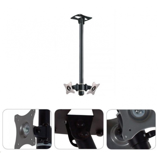 Stropný držiak TV monitoru EDBAK SV32 Profesionálny stropný držiak na zavesenie 2 televízorov alebo monitorov 17-37" za sebou, výškové nastavovanie, otáčanie, náklon, funkcia PIVOT Stropný držiak najvyššej kvality na zavesenie 2 obrazoviek s uhlopriečkou 17-37". Držiak umožňuje kompletnú nastaviteľnosť - reguláciu výšky, otáčanie jednotlivých obrazoviek na stranách, náklon a rotáciu - funkcia PIVOT. Konštrukcia je oceľová, hrubostenná. Držiak podporuje VESA štandardy 75x75 a 100x100, je možné zakúpiť rozšírenie na 200x100 a 200x200. Kabeláž je možné viesť vo vnútri držiaku. Vybrať si môžete vo 2 farebných variantoch - čierne a strieborné. Záruka 10 rokov. Stropný držiak na nezávislé zavesenie 2 obrazoviek chrbtom k sebe - Edbak SV32 Technické údaje: maximálne zaťaženie 20kg odporúčaná uhlopriečka TV alebo monitoru 17" až 37" podporuje VESA štandardy 75x75 a 100x100 za príplatok možnosť rozšírenia VESA štandardu na 200x100 alebo 200x200 dĺžka držiaku 730mm nastavenie vzdialenosti od stropu nezávislé otáčanie obrazoviek na obe strany +/- 90° náklon obrazovky nahor alebo nadol +/- 60° funkcia PIVOT - horizontálne alebo vertikálne natočenie obrazovky profesionálny stropný držiak na 2 obrazovky materiál oceľ farebné prevedenie čierne alebo strieborné záruka 10 rokov Držiak podporuje VESA štandardy: VESA 75x75 VESA 100x100 VESA 200x100 - za príplatok VESA 200x200 - za príplatok
