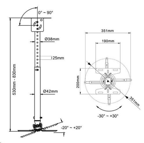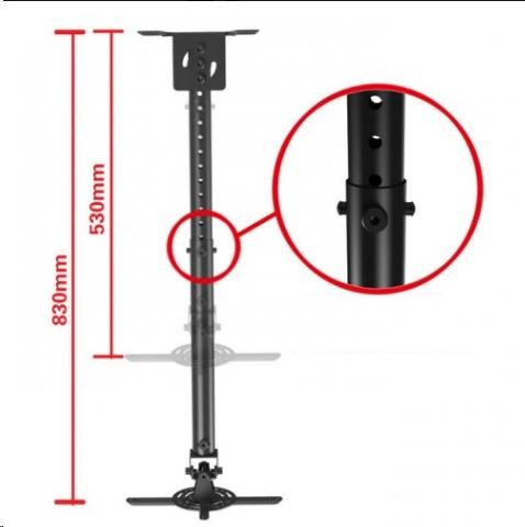 Stropný držiak na projektory Fiber Mounts T718-2 čierny Držiak na projektor, univerzálny, otočný, s nastavením sklonu a dĺžky, farba čierna Kvalitný stropný držiak na zavesenie všetkých typov projektorov s hmotnosťou do 13,6 kg. Úplná nastaviteľnosť polohy projektora - nastavenie vzdialenosti od stropu 53÷83 cm, otáčanie do strán, náklon v oboch osiach, možnosť montáže na šikmé stropy. Vynikajúca kvalita, pekný dizajn. Farba čierna. Fiber Mounts NBT718-2 stropný držiak pre projektory v čiernej farbe, otočný, sklopný, dĺžkovo nastaviteľný, aj pre šikmé stropy, TOP kvalita Špecifikácie: max. nosnosť 13,6 kg pre všetky typy projektorov s podporou zavesenia nastaviteľná vzdialenosť od stropu 530-830 mm náklon +20° až -20° otáčanie do strán +60° až -60° korekcia roviny projektora +20° až -20° možnosť preklopenia držiaka z vodorovnej polohy na zvislú podporuje 3-bodové aj 4-bodové zavesenie projektora profesionálna kvalita jednoduchá nastaviteľnosť montážny materiál súčasťou balenia krásny dizajn čierna farba záruka 5 rokov..