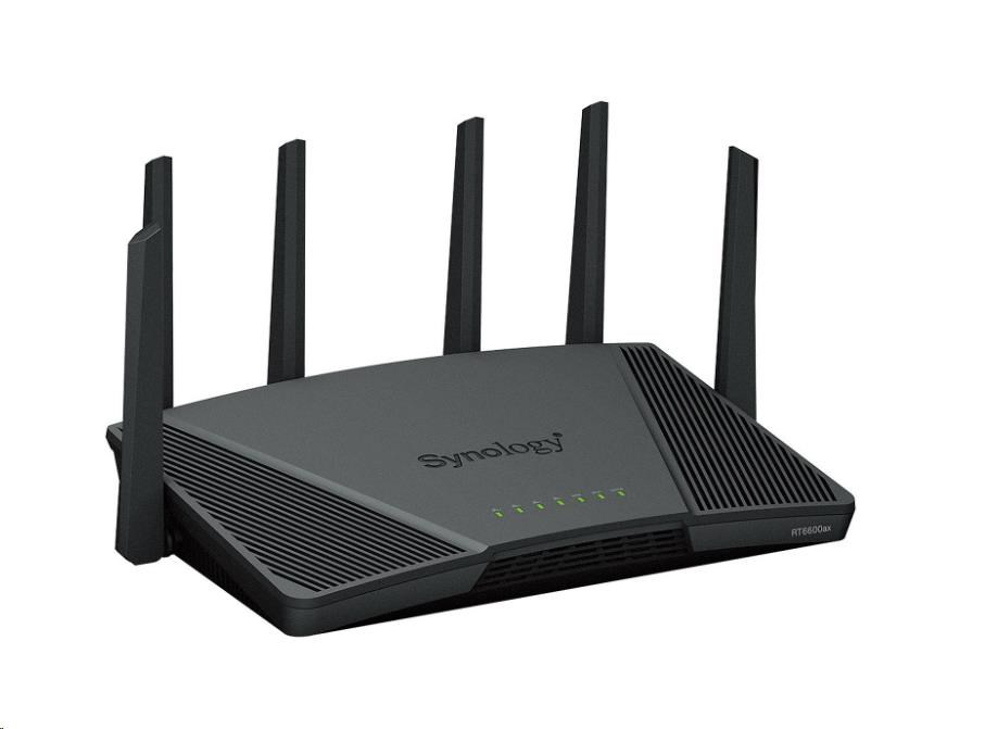 trojpásmový router RT6600ax je založený na novom štandarde Wi-Fi 6 a ponúka prenosovú rýchlosť až 6,6 Gb/s v kombinovanej bezdrôtovej prevádzke. Jeho tri rádiá pracujú v spojení s konfigurovateľným 2,5GbE WAN/LAN portom, aby sa zabezpečila maximálna rýchlosť pripojenia pre jednotlivé zariadenia. Zariadenie RT6600ax je poháňané naším neustále sa vyvíjajúcim operačným systémom Synology Router Manager a je navrhnuté tak, aby zjednodušilo zabezpečenie a správu siete.