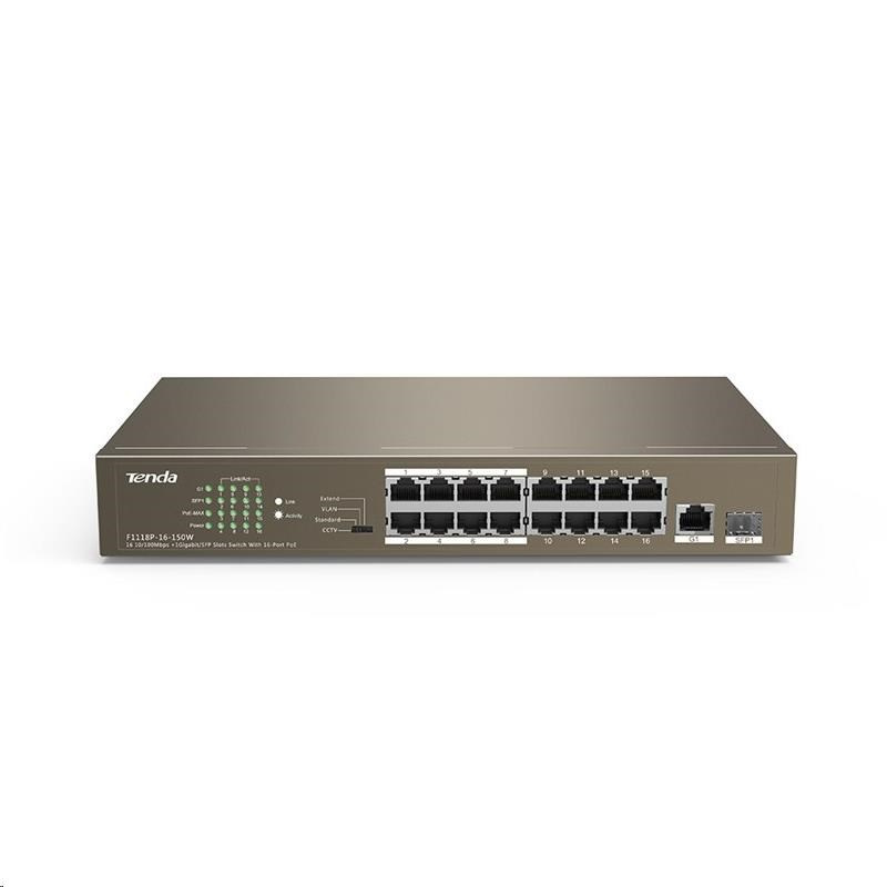 Tenda TEF1118P-16-150W prepína dáta pomocou 17 portov RJ45/SFP, 16 portov 10/100 Mbps podporuje PoE802.3af/at + 1 kombinovaný port pre Uplink (buď 1xRJ45 10/100/1000 Mbps alebo 1xSFP 100/1000 Mbps). Spínač má ochranu proti prepätiu 6 kV. Podpora prepínania uzlov typu Store-and-Forward a Cut-throught. Plne duplexné riadenie toku 802.3x, poloduplexné riadenie toku v režime Back-Pressure.