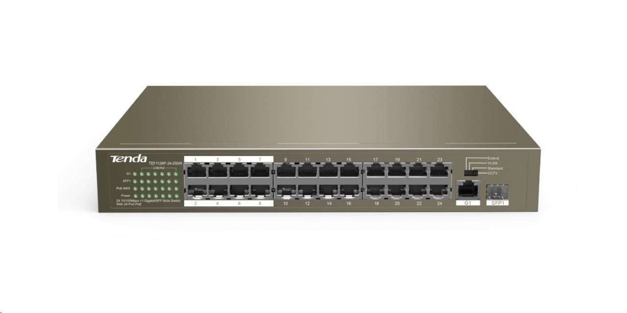 Tenda TEF1126P-24-250W prepína dáta pomocou 26 portov RJ45/SFP, 24 portov 10/100 Mbps podporuje PoE802.3af/at + 1x RJ45 10/100/1000 Mbps + 1x SFP 100/1000 Mbps pre Uplink. Spínač má ochranu proti prepätiu 6 kV. Podpora prepínania uzlov typu Store-and-Forward a Cut-throught. Plne duplexné riadenie toku 802.3x, poloduplexné riadenie toku v režime Back-Pressure. Model TEF1126P-24-250W je vhodný pre malé a stredné firmy, ako aj pre domácnosti.
