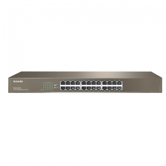 Tenda TEG1024G prepína dáta pomocou 24 portov RJ45 s rýchlosťou 10/100/1000 Mb/s s automatickou detekciou rýchlosti. Spínač má ochranu proti prepätiu 6000 V. Podpora prepínania uzlov typu Store-and-Forward. Plne duplexné riadenie toku 802.3x, poloduplexné riadenie toku v režime Back-Pressure. Maximálna priepustnosť 48 Gb/s. Balenie obsahuje kovové "L" konzoly na montáž do rozvádzača. Prepínač je napájaný z interného zdroja.